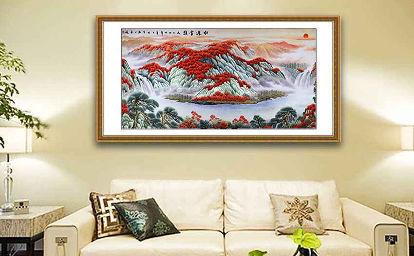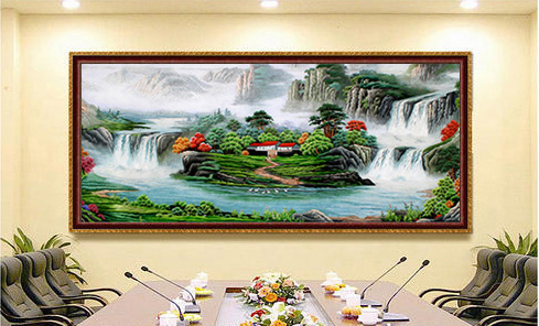 會議室也是一個公司不可忽略的辦公場所,為會議室裝飾一幅大氣壯麗的刺繡國畫山水,