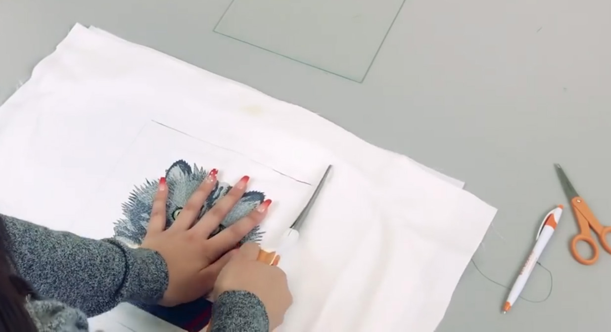 將繡品取下后根據相框的尺寸剪好,然后裝入相框
