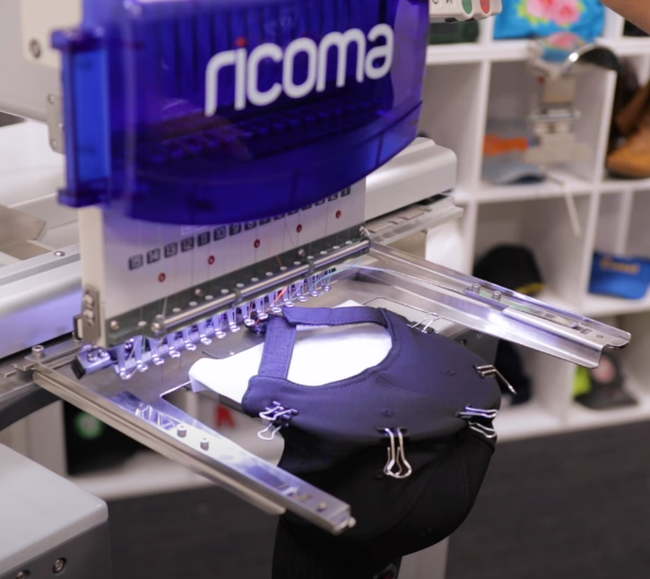 弧形裝置操作非常方便,只需要打開框架,箍上帽子,合上框架,就可以將裝置插入機器,開始刺繡。