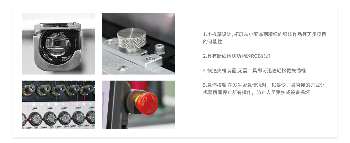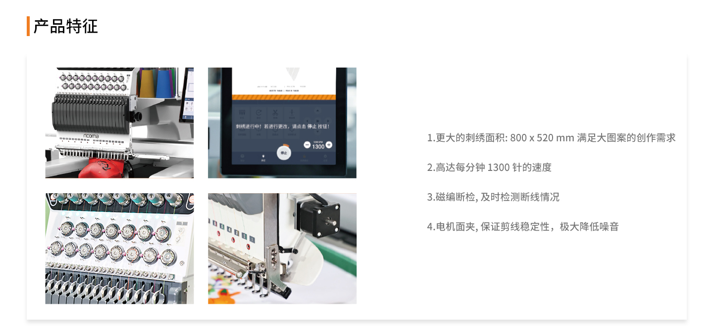 | 機器型號 | 頭數(shù) | 針數(shù) | 凈重 | 刺繡面積 | 機器尺寸 |